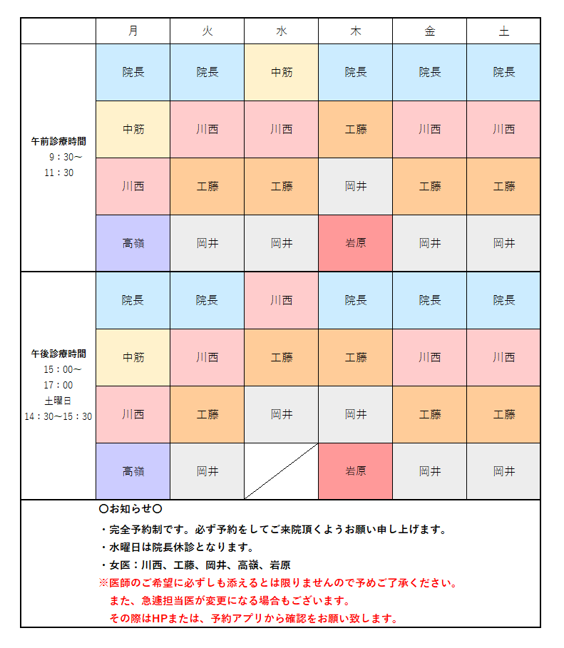 また、10月より川西医師の休診日が木曜日に変更となります。